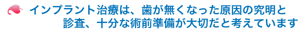 当院では単に歯が無くなったところにインプラントをするのではなく、歯が無くなった原因の究明と診査、十分な術前準備が大切だと考えてインプラント治療に取り組んでいます。