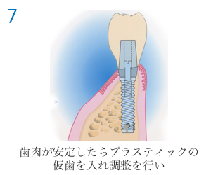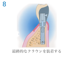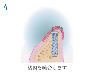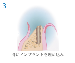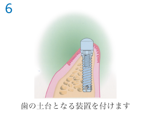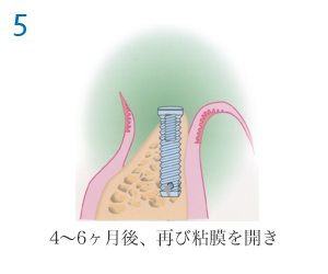インプラントを顎の骨に植え込む1次手術と、インプラントが顎の骨と生着した後にインプラント用の人口歯を取り付ける支台を装着する2次手術、そして歯列の型を採る印象採得、その模型を用いて制作したインプラント用人口歯の装着、その他などで最低でも6〜8回の通院が必要です。通院期間は、個人差(約3カ月〜6カ月程度)がありますので、よく説明をお聞きください。